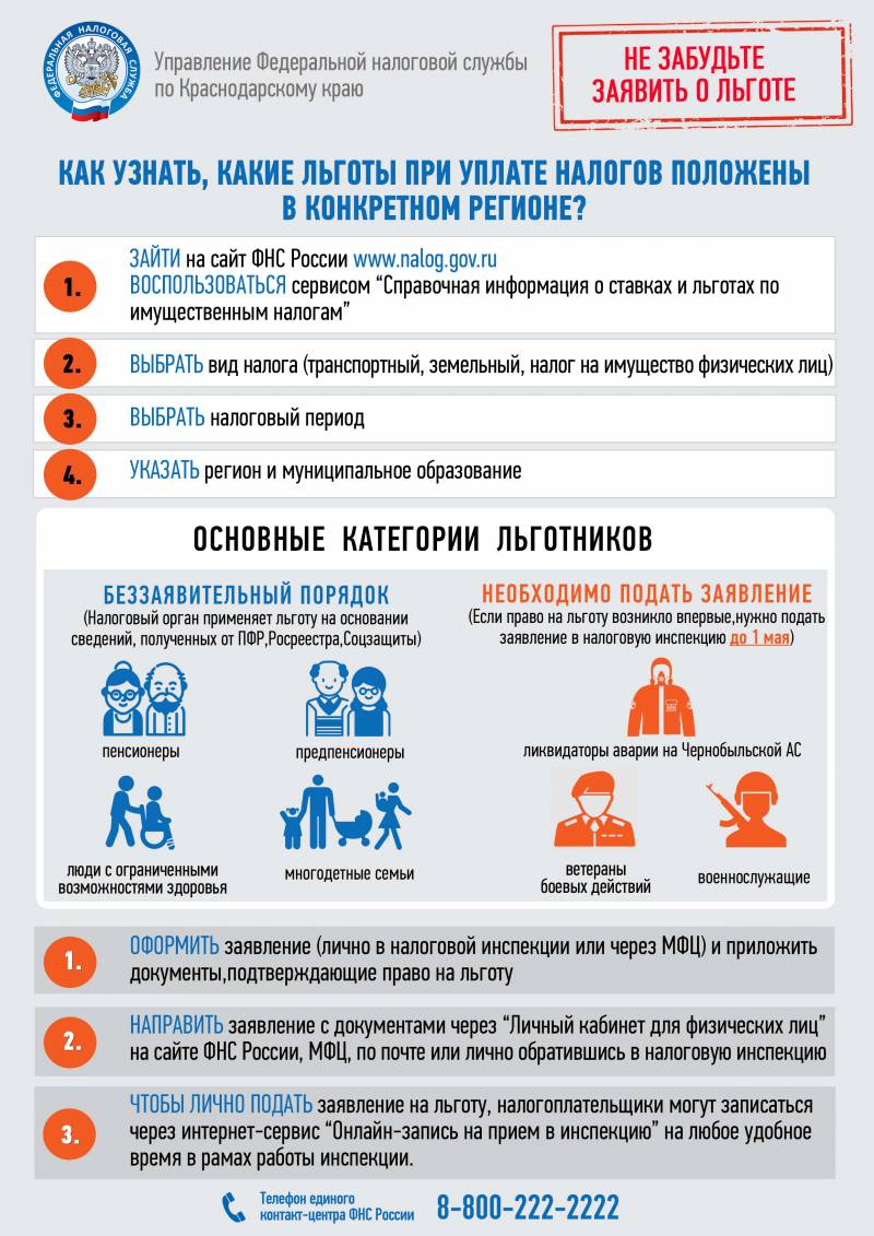 Обращаем внимание, что в настоящее время для отдельных категорий граждан установлен беззаявительный порядок предоставления льгот. К таковым относятся лица, относящиеся к следующим категориям физических лиц, в частности: - пенсионеры, а также лица, достигшие возраста 55 и 60 лет (соответственно для женщин и мужчин); - инвалиды I и II группы; - лица, имеющие трех и более несовершеннолетних детей; - владельцы хозпостроек площадью объекта не более 50 кв. м.; - предпенсионеры. Это значит, что налоговый орган применяет льготы на основании сведений, полученных при информационном обмене с ПФР, Росреестром и региональными органами соцзащиты населения. Важно отметить, что в связи с запланированным с 2019 года поэтапным повышением пенсионного возраста льготы по имущественным налогам будут предоставляться предпенсионерам. Указанные лица имеют право на льготу по налогу на имущество физических лиц и земельному налогу, как и пенсионеры. А именно, льгота предоставляется на один объект недвижимости каждого вида (квартира, часть квартиры или комната; жилой дом или часть жилого дома; гараж или машино-место), если он не использовался в предпринимательской деятельности и вычет на один земельный участок, уменьшающий сумму исчисленного земельного налога на величину кадастровой стоимости 600 кв. м. площади. Стоит отметить, что в отношении налогоплательщиков, имеющих трех и более несовершеннолетних детей предусмотрены дополнительные меры государственной поддержки при исчислении налога на имущество физических лиц, выраженные в уменьшении налоговой базы на величину кадастровой стоимости 5 квадратных метров общей площади квартиры, площади части квартиры, комнаты и 7 квадратных метров общей площади жилого дома, части жилого дома в расчете на каждого несовершеннолетнего ребенка. Обращаем особое внимание граждан, имеющих статус льготной категории налогоплательщиков, но не поименованных выше. Рекомендуем Вам заявить о своем праве на льготу до начала массового формирования налоговых уведомлений за 2023 год, то есть до 1 мая 2024 года. Заявление о льготе может быть представлено по ТКС, лично, по почте, а также передано через МФЦ. Форма заявления о льготе утверждена приказом ФНС России от 14.11.2017 N ММВ-7-21/897@ "Об утверждении формы заявления о предоставлении налоговой льготы по транспортному налогу, земельному налогу, налогу на имущество физических лиц, порядка ее заполнения и формата представления заявления о предоставлении налоговой льготы в электронной форме". С полным перечнем дополнительных (не отраженных в Налоговом кодексе) льгот, установленных представительными органами муниципальных образований Краснодарского края, на территории которых расположены объекты налогообложения, можно ознакомиться на официальном сайте ФНС России в разделе «Справочная информация о ставках и льготах по имущественным налогам». | |